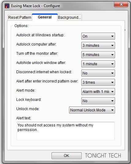 After setting up a new pattern, click on General Tab. Here you have you set Maze lock settings like turning on Autolock at windows startup/after specified time, adding alert text…